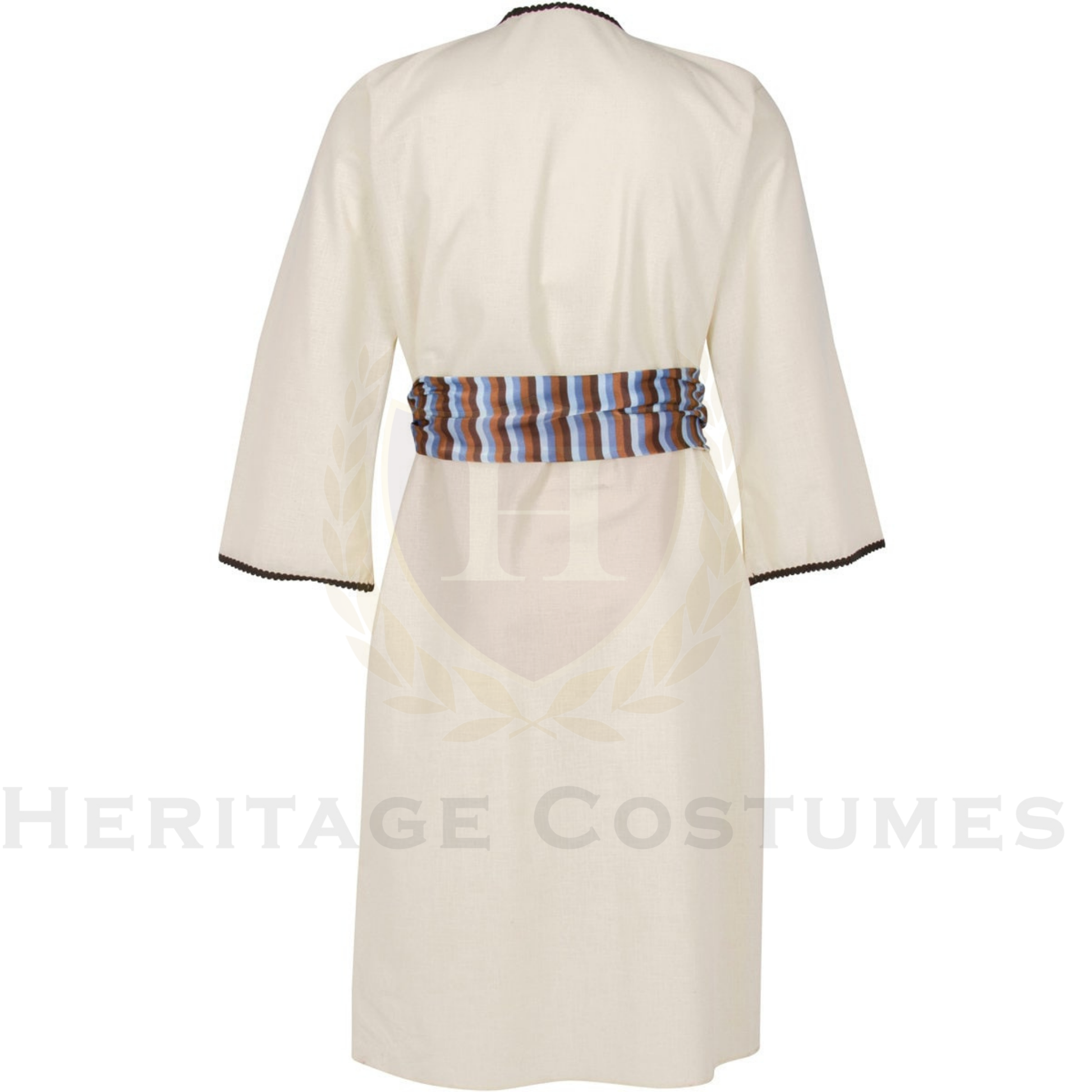 Children's V-Neck Caftan (Robe) with/brown placket and full sleeves, Sudra (headscarf), and matching striped waist sash.