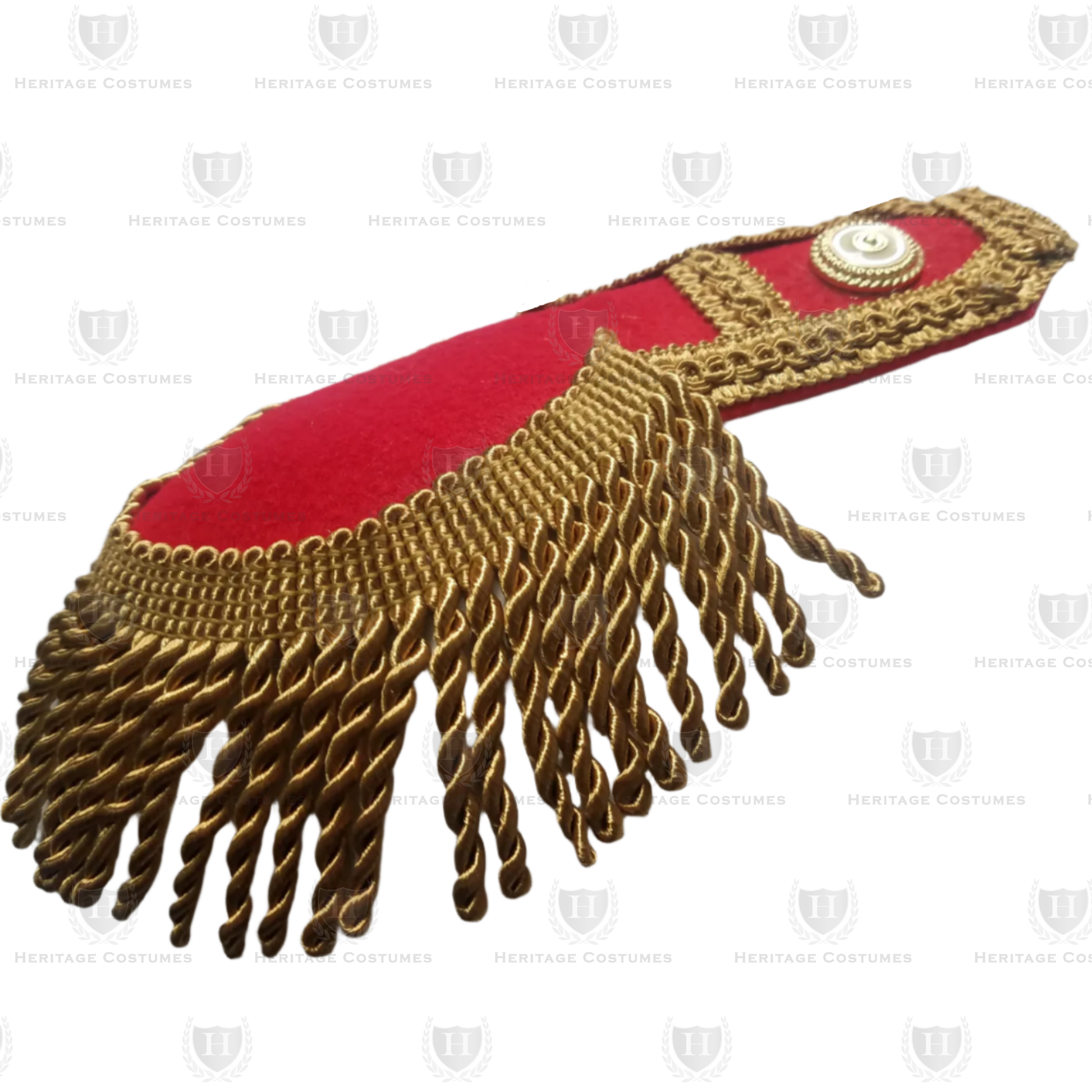 6️⃣ Red Shoulder Boards (Epaulets) – Trimmed with gold metallic detailing, worn on the shoulders to indicate officer rank.