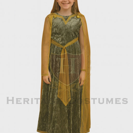Our Demeter costume includes a green velvet dress, gold waist sash, and gold cape inspired by her association with the earth and agriculture; also included are a gold harvest leaf bracelet and ornate gold jeweled crown representing her status as a goddess and her importance in ancient Greek religion.