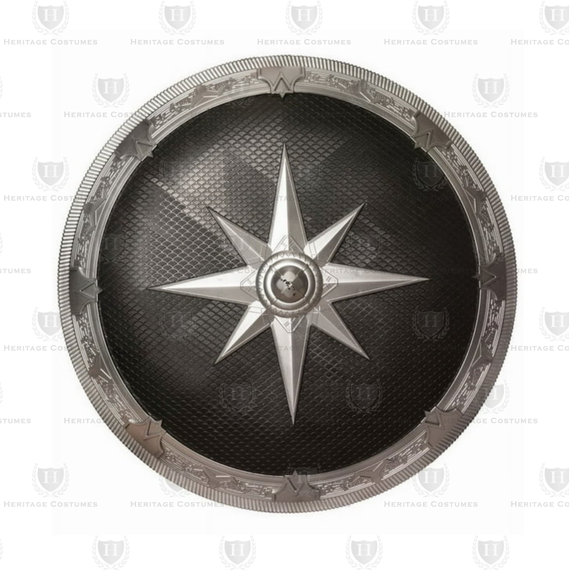 7️⃣ Silver & Black Grecian Shield. It measures 18” wide, molded in durable, rigid plastic with raised Greco-Roman designs. Perfect for stage, cosplay, or reenactments.