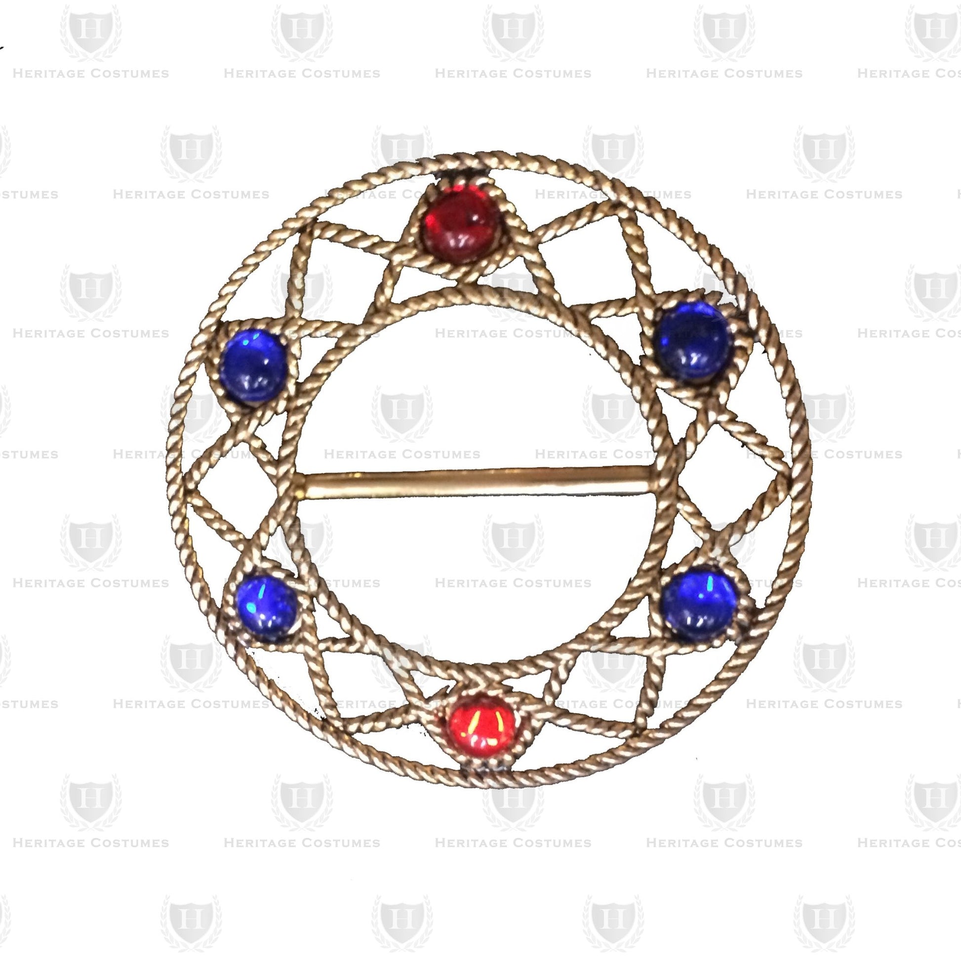5️⃣ A gold jeweled circular shoulder adornment secures the drape in place, adding a regal finishing touch to the costume.